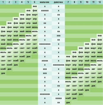 Во второй таблице приводятся данные в обратном порядке. Вверху идут по горизонтали семейные числа, по вертикали – месяцы. Середина отведена под две вертикальные колонки, где крестиками указана вероятность зачатия малыша определенного гендера.