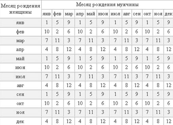Расчет пола ребенка по дате рождения родителей – метод, имеющий отношение к японским таблицам. В них по вертикали по порядку перечислены месяцы года. По горизонтали прослеживается та же система, но только для мужчин. Нужно выбрать месяцы рождения родителей, и на пересечении клеток найти так называемое семейное число пары.